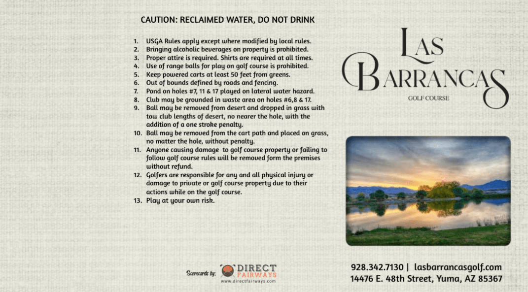 Las Barrancas is the Yuma area’s newest 18-hole golf facility. Five sets of tees, undulating greens, elevation changes and great views in all directions make this Yuma’s most interesting and challenging golf course. For entertainment purposes the half-acre putting course is great fun. Standard green fee includes golf and cart. Buckets are availble for range usage.